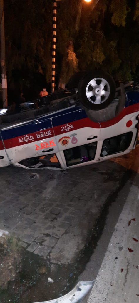 दुर्घटना में पलटी हुई पुलिस की प्रखर गाड़ी