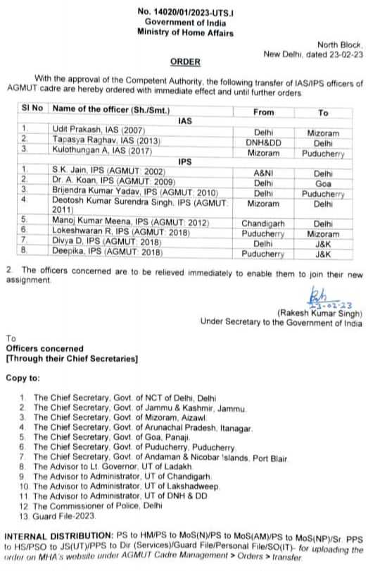 ♦ AGMUT केडर के कई IAS और IPS के तबादलों की लिस्ट गृह मंत्रालय द्वारा जारी