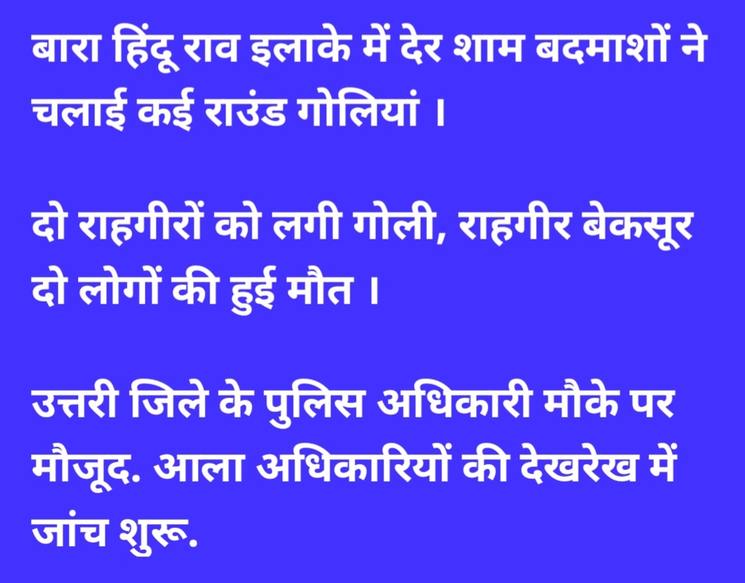 उत्तरी दिल्ली : बाड़ा हिंदू राव इलाका आज आज रात गोलियों की गड़गड़ाहट से गूंज उठा शाम साढ़े नौ से दस बजे के करीब कुछ अज्ञात हमलावरों ने इलाके में अंधाधुंध गोलियां चलाई. गोलीबारी में हमलावरों की गोली की चपेट में दो राहगीर आ गए. बताया जा रहा है कि हमलावर जिस व्यक्ति पर गोलियां चलाने के लिए आए थे वह तो इस हमले में बाल-बाल बच गया ,लेकिन दो राहगीर इस हमले की चपेट में आ गए जिनकी मौत हो गई.