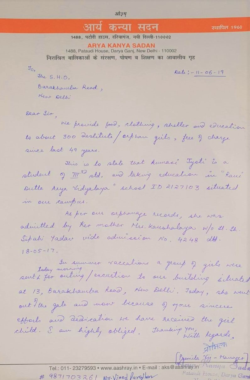 पुलिस को बताया कि अनाथालय से कुछ छात्राओं को बराखम्बा इलाके में बने दूसरे अनाथालय में घुमाने ले गए थे, वहीं से एक छात्रा अपने ग्रुप से बिछड़ गई थी । पुलिस ने चौतरफा जांच के बाद लड़की को पूरी हिफाज़त के साथ अनाथालय प्रशासन को सौंप दिया । पुलिस की इस कार्यवाही पर अनाथालय प्रशासन ने दिल्ली पुलिस का आभार प्रकट करते हुए धन्यवाद पत्र भी भेंट किया है।
